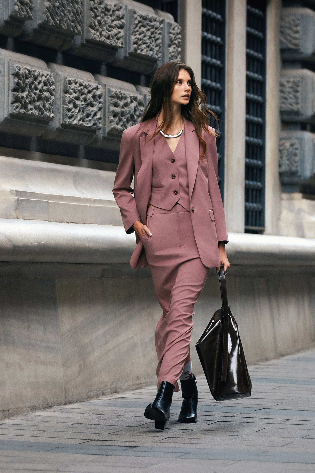 Zengin vizon tonlarında sunulan bu tek düğmeli blazer ceket.